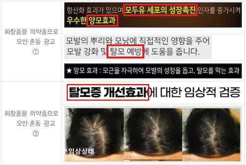 ※ (화장품)‘탈모 치료’, ‘탈모 예방’, ‘모발 증가’, ‘양모’, ‘두피염증 완화’ 등과 같이 의약품처럼 광고