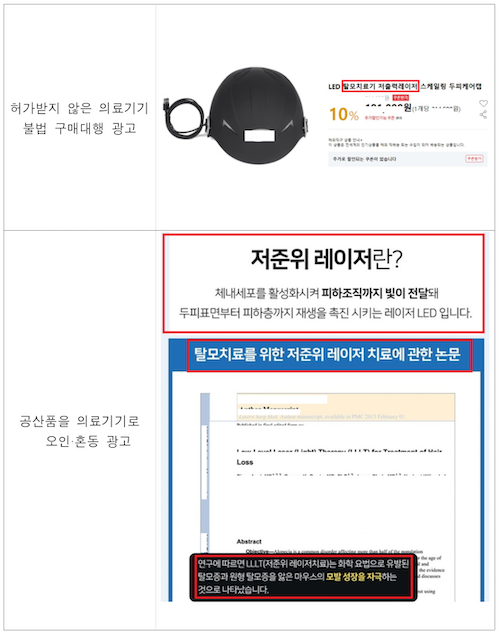 - (공산품을 의료기기로 오인‧혼동시키는 광고) 의료기기 아닌 공산품을 탈모 치료에 사용하는 의료기기로 오인할 수 있는 광고(7건)