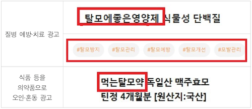 ※ (식품)‘탈모 예방’, ‘탈모에 좋은’, ‘탈모약’ 등과 같이 치료 효과를 내세운 광고