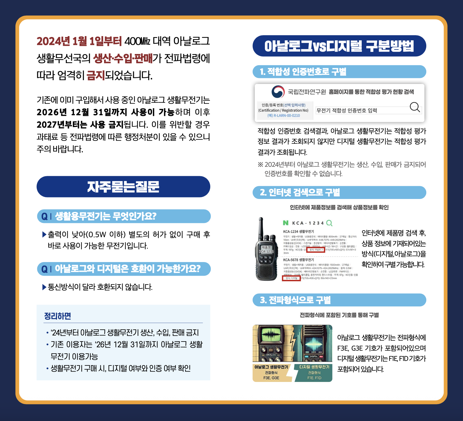 아날로그(400Mhz 대역)의 생활무전기는 관련 법령에 따라 2024년 1월 1일부터 생산/수입/판매가 금지되었습니다.