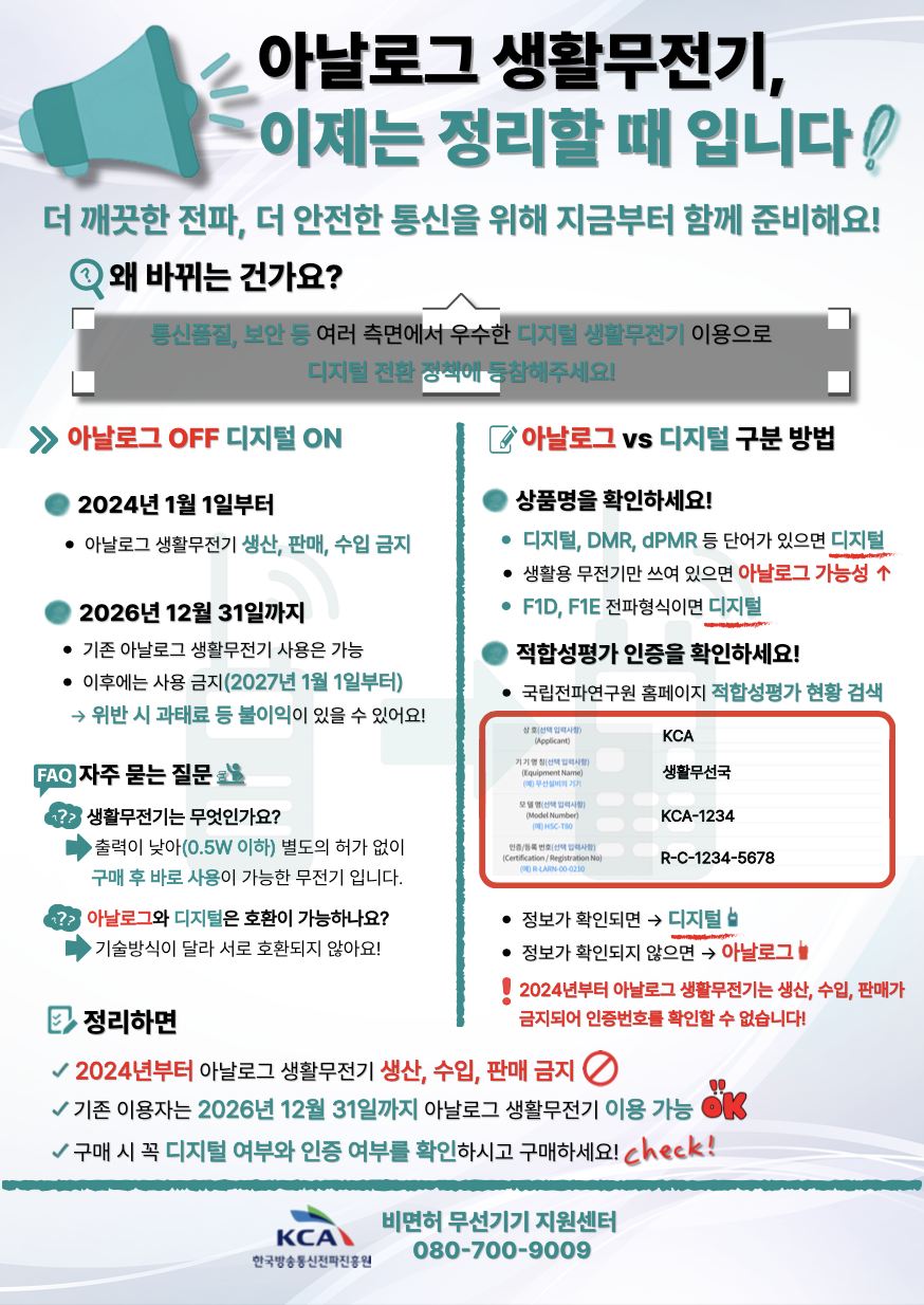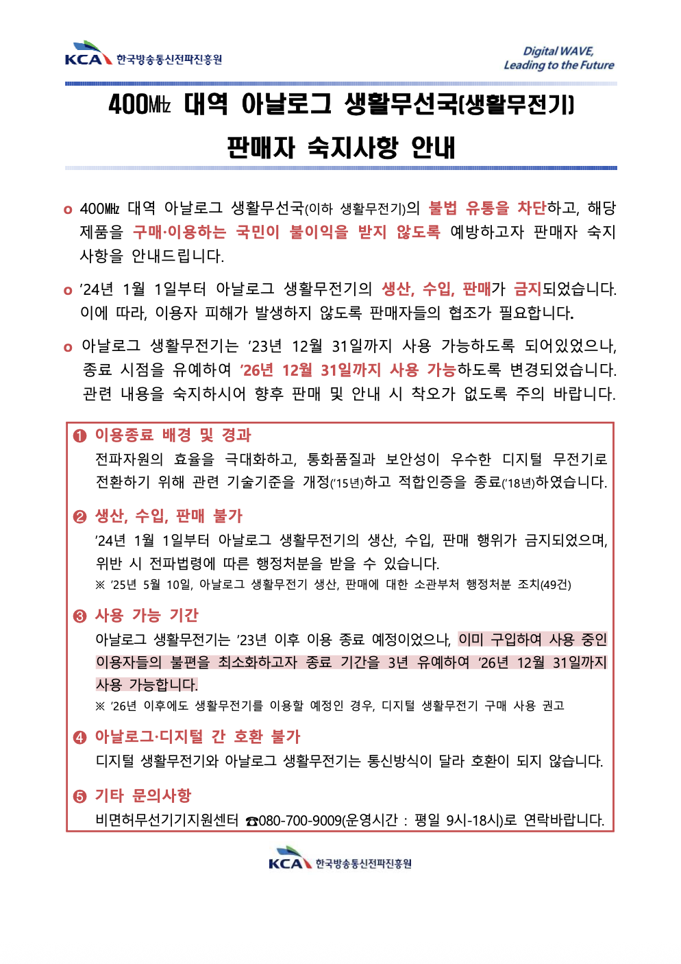 [한국방송통신전파진흥원] 아날로그 생활무전기(400Mhz 대역) 판매 불가 안내 서비스 공통2025-06-11