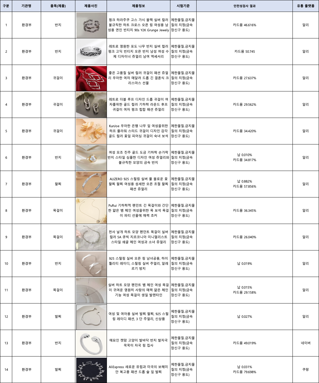 공지사항 본문 [환경부] 해외직구제품 소비자 안전성 조사 결과 안내 서비스 공통2025-08-27안녕하세요 카카오커머스 안전거래센터입니다. 환경부에서 공표한 해외직구 제품 안전성 조사 결과를 안내드립니다. 판매자께서는 첨부한 제품 목록을 확인하시고, 안전성 검사 결과 기준치를 초과한 제품이 유통/판매되지 않도록 적극적으로 협조하여 주시기 바랍니다. 감사합니다. 목록으로