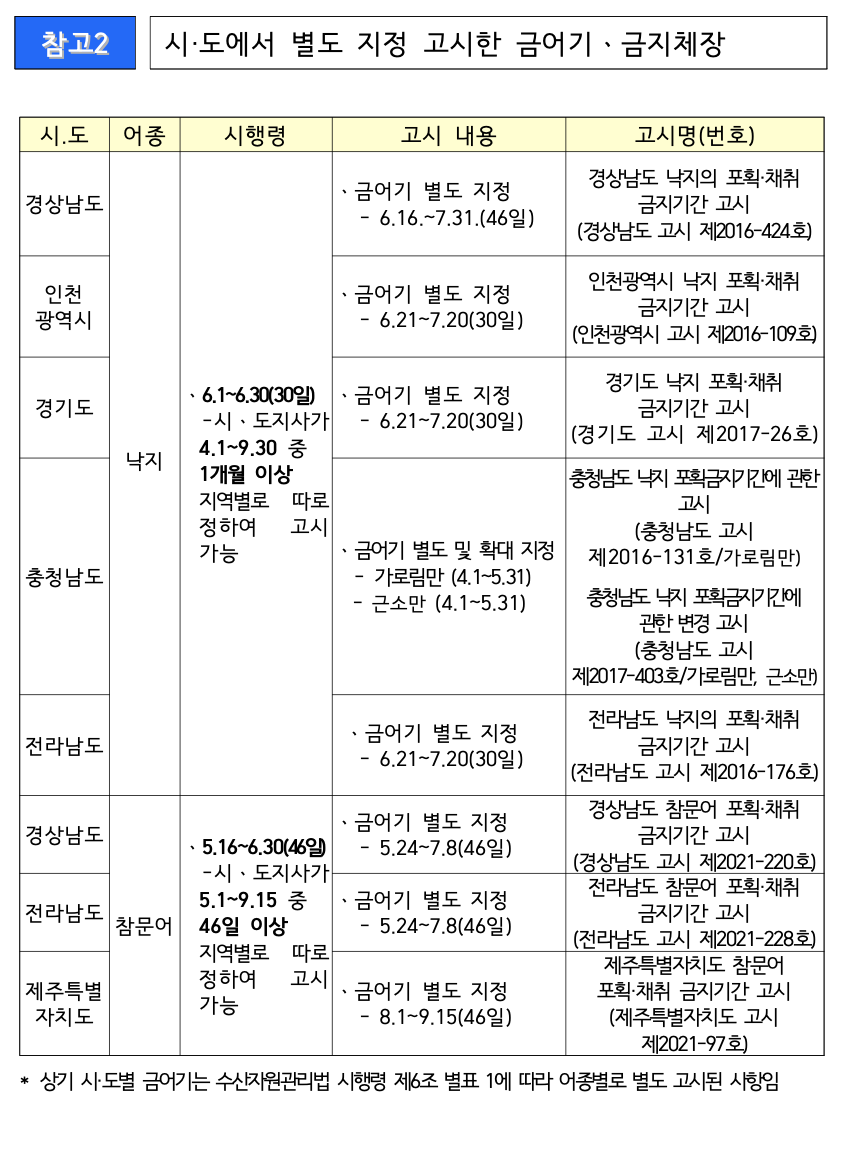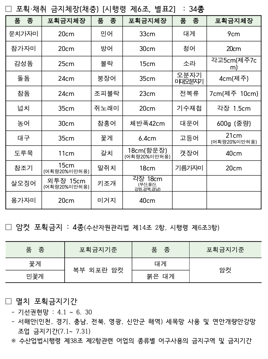 <수산자원의 금어기∙ 금지체장 관련 주요 기준>