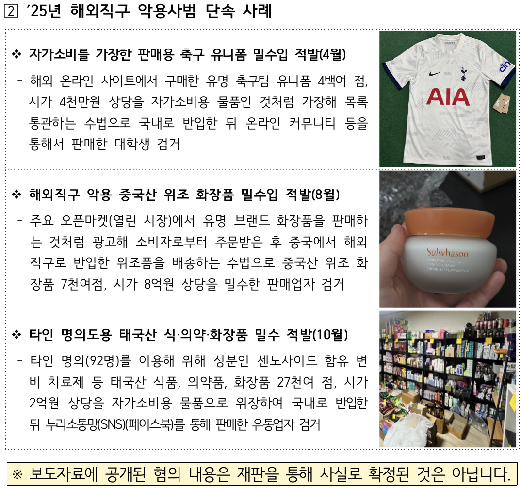 ㅇ 주요 단속 분야 : 개인통관고유부호 도용 행위, K(케이)-브랜드 등 지식재산권 침해물품 불법 수입행위, 사회 안전 위협 물품(무허가 총,포,도검류 및 석궁 / 전자충격기 등) 판매 행위 등