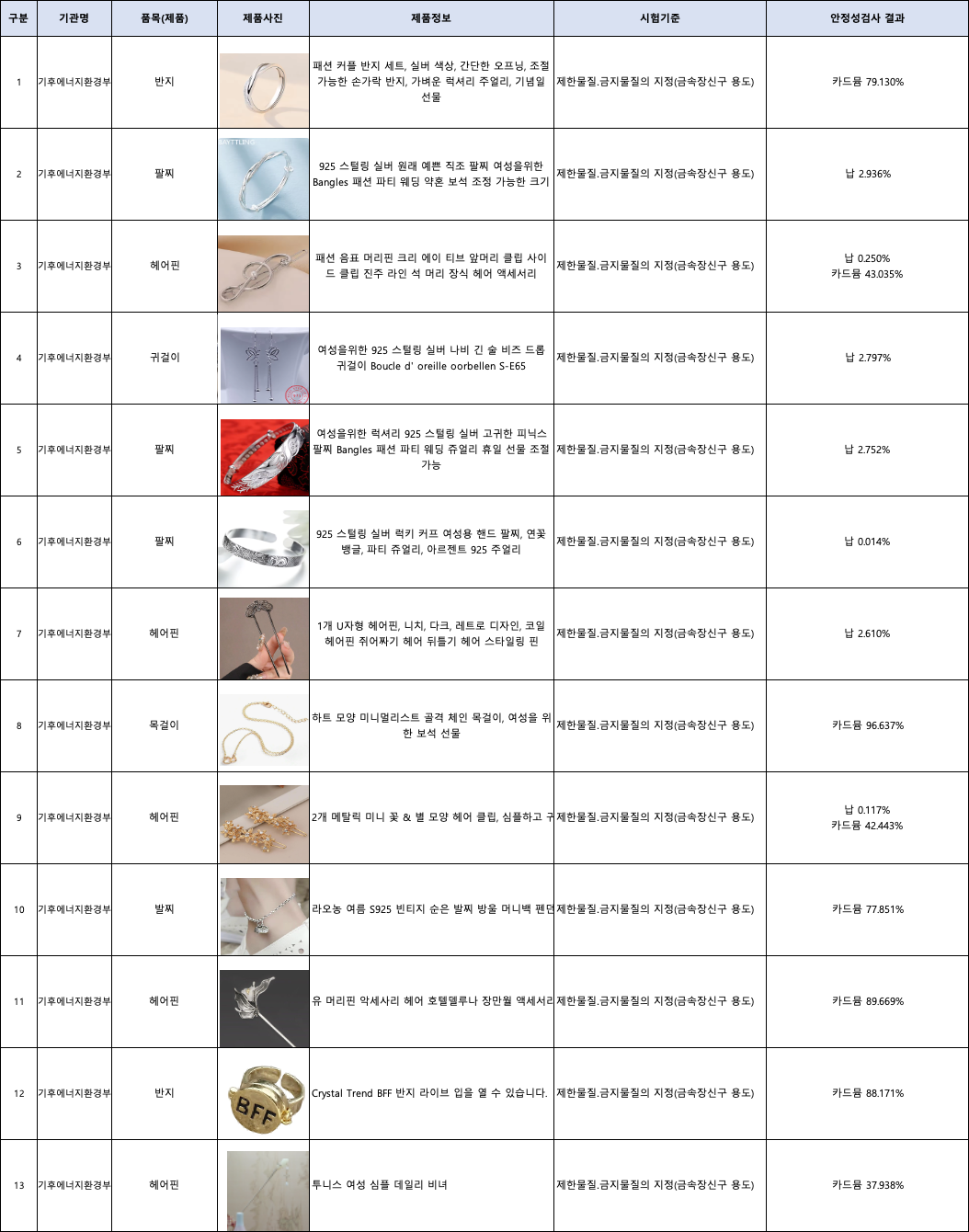공지사항 본문 [기후부] 해외직구제품 소비자 안전성 조사 결과 안내 서비스 공통2026-01-12안녕하세요 카카오쇼핑 안전거래센터입니다. 기후에너지환경부에서 공표한 해외직구제품 소비자 안전성 조사 결과를 안내드립니다. 판매자께서는 첨부한 제품 목록을 확인하시고, 안전성 검사 결과 기준치를 초과한 제품이 유통/판매되지 않도록 적극적으로 협조하여 주시기 바랍니다. 감사합니다. 목록으로