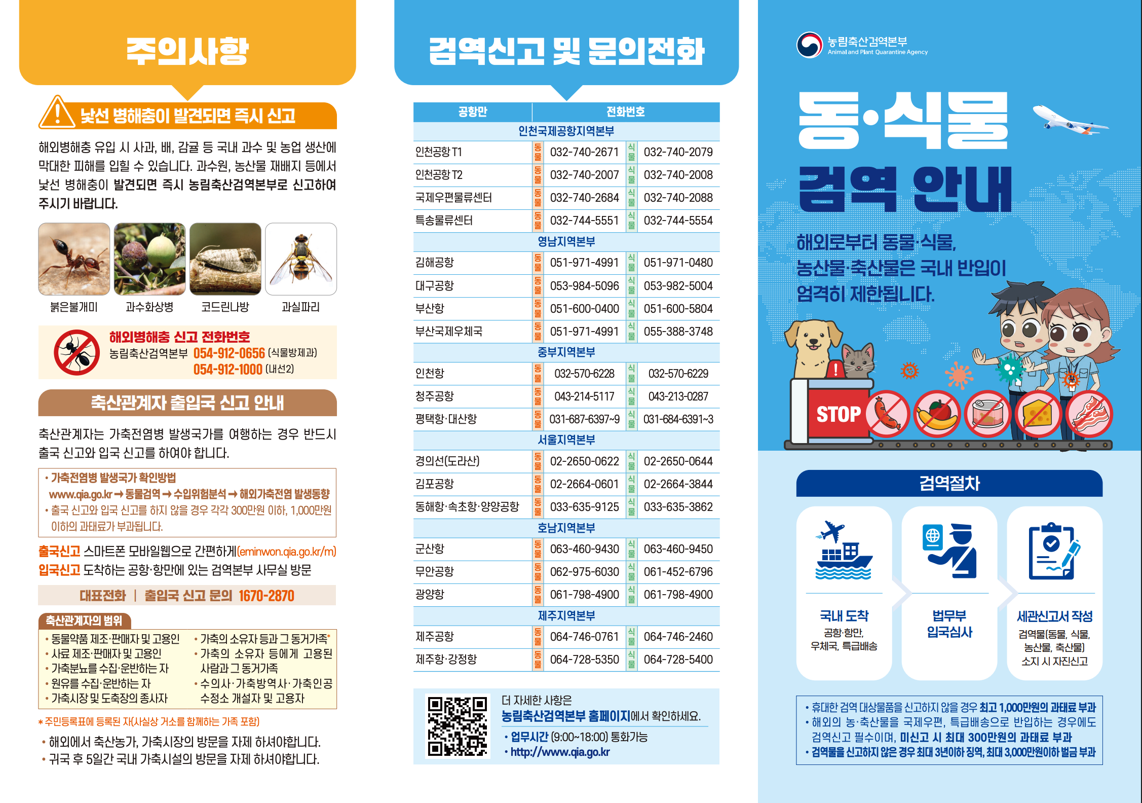 농림축산검역본부에서는 해외에서 유입될 수 있는 가축 전염병 및 식물류 명해출 유입을 방지하기 위해 전국 공항만에서 검역업무를 진행하고 있습니다.